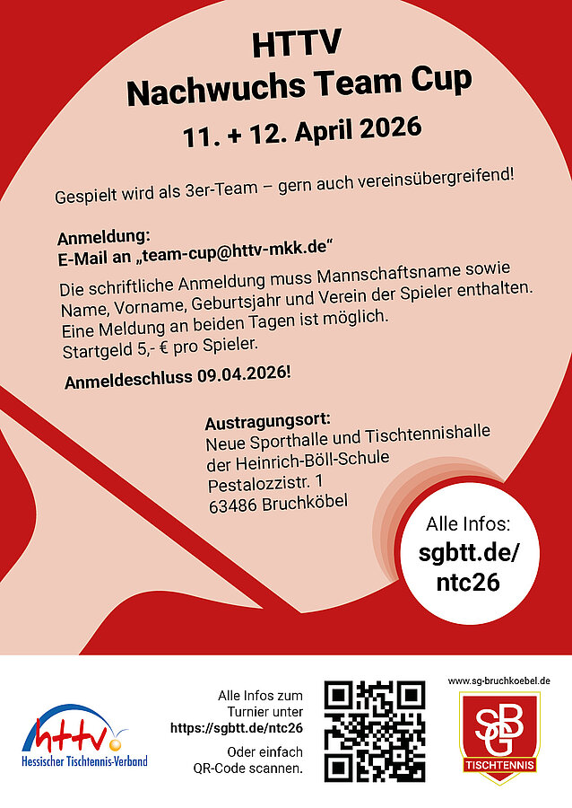 Der diesjährige HTTV Nachwuchs Team-Cup findet am 11. + 12. April 2026 erstmalig in Bruchköbel statt. Die SG Bruchköbel 1868 und der Main-Kinzig-Kreis freuen sich auf zahlreiche Teams und Spieler.