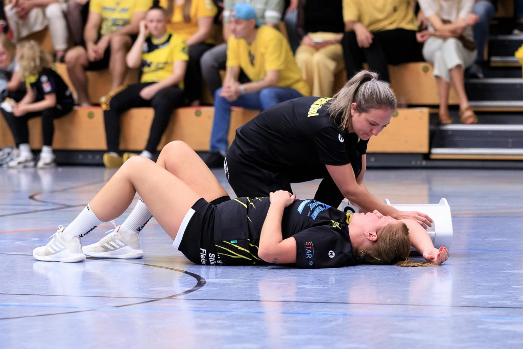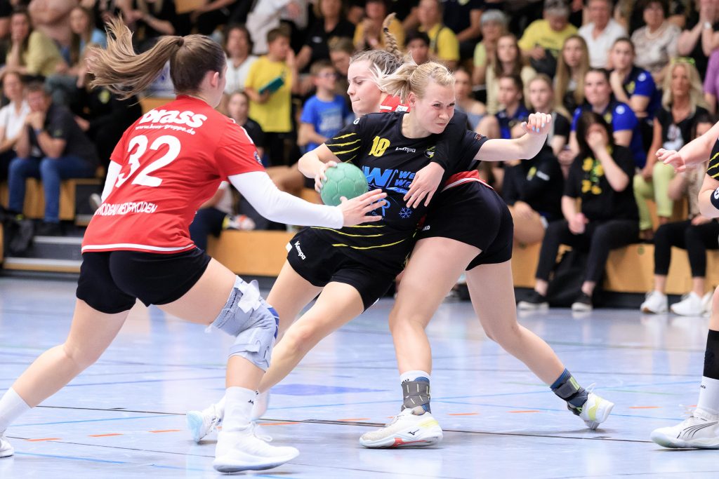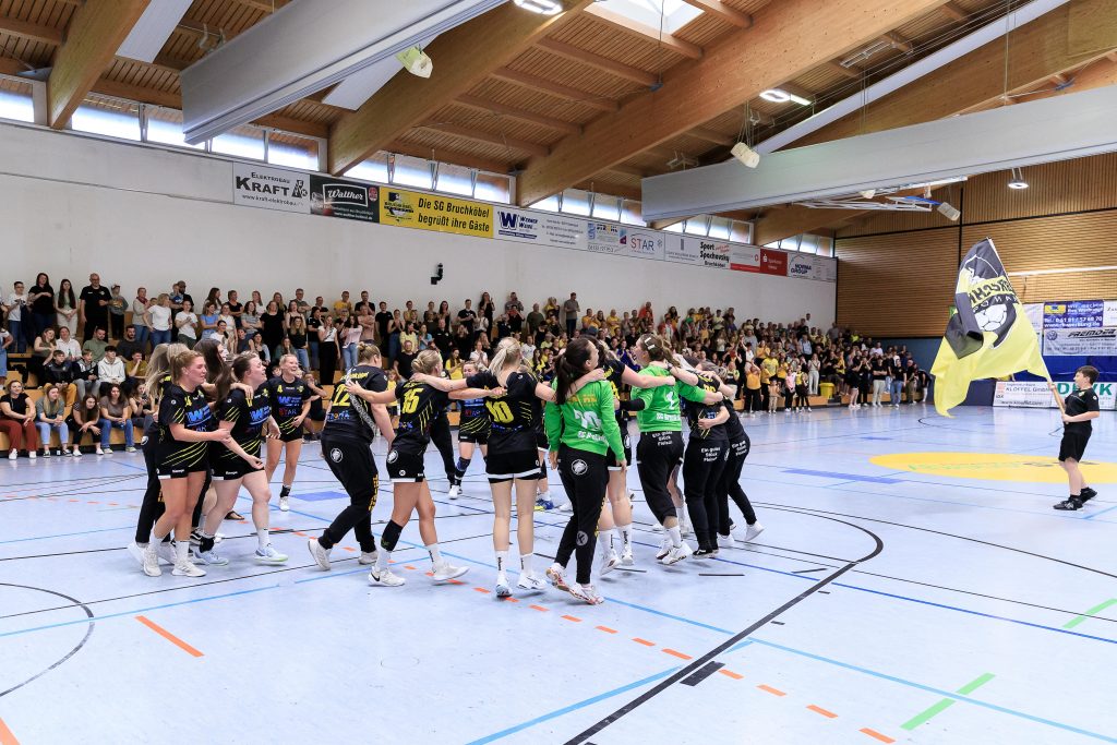 Kommen wir zur Schlussphase. In die letzten fünf Minuten ging die SGB mit einer 17:16-Führung. Die folgenden Minuten sahen im Liveticker folgendermaßen aus: Zeitstrafe SGB, 17:17, Zeitstrafe SGB, 17:18,18:18, Zeitstrafe SGB, 18:19, 19:19, Zeitstrafe SGB. Vor Ort war die Spannung unerträglich, weshalb es das Publikum in den letzten drei Minuten auch nicht mehr auf den Sitzen hielt. Nach 58 Minuten warf Anika Nazarenus das 19:19, genug Zeit also für Rodgau noch ein Tor zu erzielen und das Spiel und somit die Meisterschaft für sich zu entscheiden. Die Chance dazu wurde zunächst vergeben und die SGB war in der letzten Minute in Ballbesitz, das Unentschieden wäre der Sieg für Bruchköbel. Doch ein Abspielfehler sorgte dafür, dass der Gast noch einmal seine Chance bekam. 20 Sekunden für ein Tor wäre möglich, doch als Rodgau den entscheidenden Treffer vorbereiten will, foult Maxi Dietrich acht Sekunden vor Schluss ihre Gegenspielerin, indem sie ihr von der Seite in die Parade fährt. Das Foul findet noch im Spielaufbau statt, es wird also keine Torchance damit verhindert. Allerdings wird verhindert, dass die Rodgauerinnen in die Abwehr eindringen können und eventuell einen Strafwurf herausholen. In den nun verbleibenden Sekunden kommt Rodgau zwar noch einmal zum Abschluss, der letzte Wurf wird aber von Coco Herzog im Tor entschärft. Die Zeit läuft ab und die Dreispitzhalle explodiert. Platzsturm in Gelb und Schwarz. Das 19:19 reicht zur Meisterschaft. Die SGB hat 41:3 Punkte, Rodgau 40:4. Die SGB-Abwehr hat die Saison entschieden. Im letzten Spiel hat sie auch den letzten Zweifler überzeugt, über die gesamte Saison hat sie 136 Tore weniger zugelassen als die Abwehr des direkten Konkurrenten.