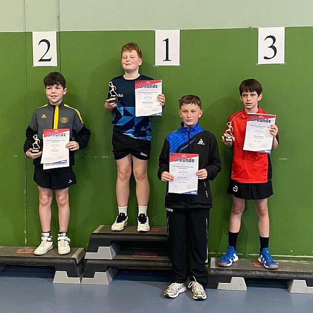 Bei der Jugend sind die Teilnehmerfelder größer. Dort belegte dann in der Altersklasse 9 bei seiner Premiere bei diesen Meisterschaften Luis Fernandes einen guten 2. Platz. In der Konkurrenz AK 11 kam in seinem ersten größeren Wettkampf Elias auf den 7.Rang. Henry erspielte sich am Ende eines aufregenden Tages Platz 5. Die Jugend 12 war eine sehr starke Konkurrenz, dort schaffte Jonas es nach einer knappen Halbfinalniederlage gegen den späteren Sieger aus Bad Orb aufs Podium. In der Jugend 13 belegte Jacob nach vielen langen Ballwechseln einen tollen 5. Platz.