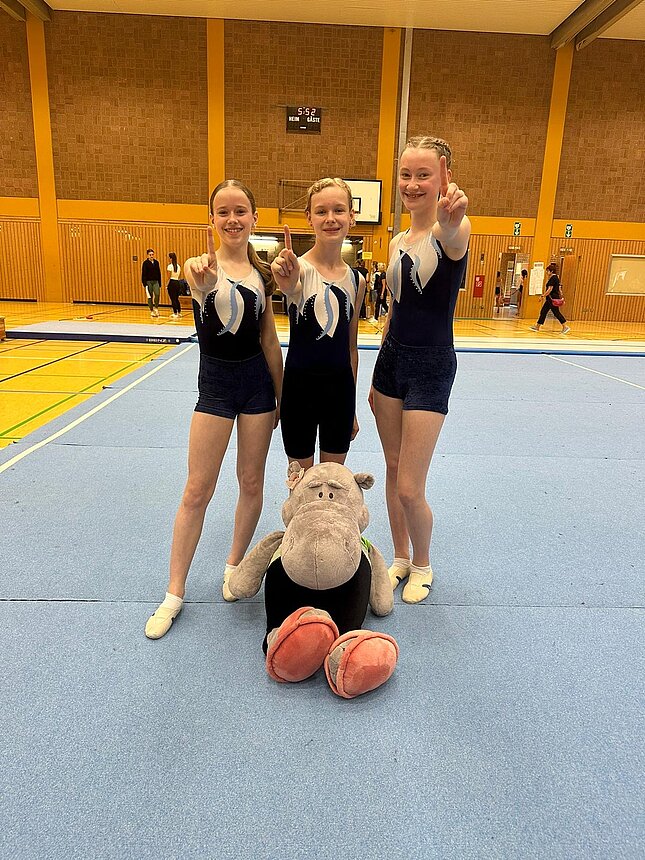 Durch den Ausfall einer Turnerin mussten Finja, Alina und Angelina den Wettkampf alleine bestreiten. Durch den Wegfall einer möglichen Streichwertung wurden alle Übungen der Mädels mit in das Gesamtergebnis verrechnet – das bedeutet Nerven bewahren!