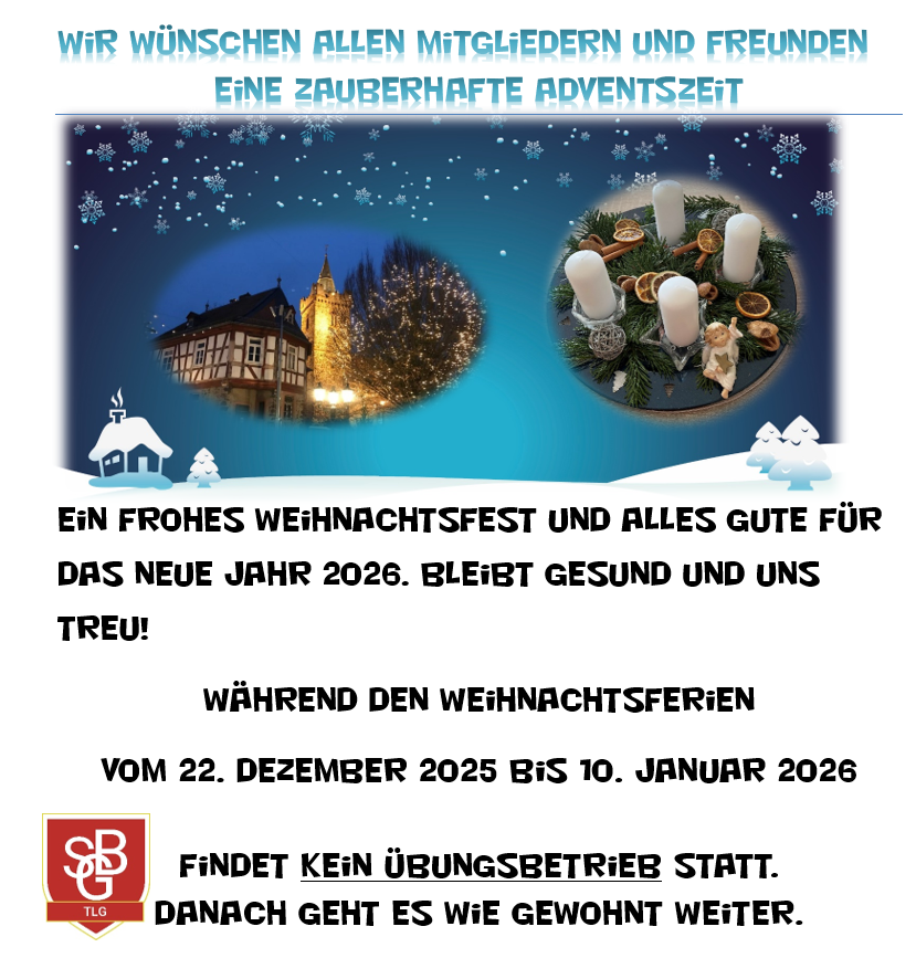 In den Weihnachtsferien machen wir „SGB-Abteilung TLG“ eine kurze Trainingspause, wir gönnen auch unseren Muskeln eine „kleine“ Weihnachtszauber-Pause – Ausnahmen verraten euch die Übungsleitenden.