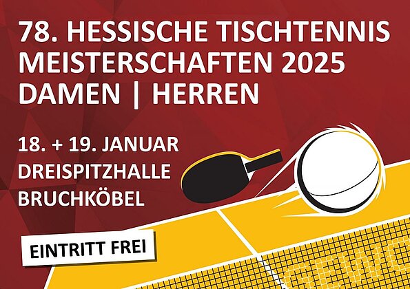 Der Abteilung Tischtennis der SG Bruchköbel ist es gelungen, die Hessischen Tischtennis Meisterschaften der Frauen und Männer vom 18.- 19.01.2025 unter Schirmherrschaft von Frau Bürgermeisterin Sylvia Braun nach Bruchköbel in die Dreispitzhalle zu holen. 16 Frauen und 24 Männer haben sich in den verschiedenen Bezirksvorentscheidungen für diese Meisterschaften qualifiziert. Es werden an beiden Tagen spannende Spiele und faszinierende Ballwechsel in der Dreispitzhalle in Bruchköbel erwartet. Der Eintritt ist frei und für das leibliche Wohl der Zuschauer sorgt die Tischtennisabteilung der SG Bruchköbel.