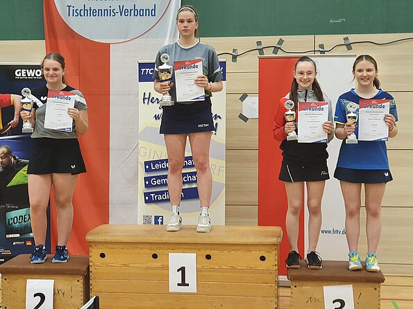 Das Damentrio Sabrina Buschmann, Finja Thiele und Lara da la Fuente Cura starteten in der Damen C-Klasse. Nach einer makellosen Gruppenphase erreichten alle drei das Hauptfeld. Bereits im Achtelfinale schied die erst 14-jährige Lara überraschend früh aus. Teamkollegin Sabrina schaffte es eine Runde weiter bis ins Viertelfinale. Genau dort schlug die Sternstunde von Finja Thiele. Die Hessenligaspielerin überzeugte mit einem kompromisslosen Offensivspiel und siegte gegen die an Position Eins gesetzte Spielerin in einem knappen 5-Satz Krimi. Im Halbfinale gewann die 15-jährige klar mit 3:0 gegen die Spielerin, die zuvor Sabrina aus dem Turnier geworfen hat. Im Finale erspielte sie sich schnell eine 2:0 Satzführung. Den Titel zum Greifen nahe wurde die eigene Nervosität zum Verhängnis. Die drei weiteren Sätze und somit der Titel gingen knapp verloren. Dennoch kann sie sich mit dem zweiten Platz über die Qualifikation zu den deutschen Meisterschaften freuen.