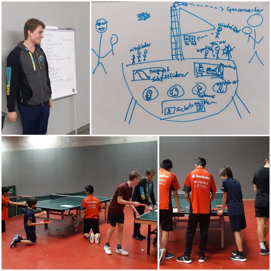 Die u15 Trainingsgruppe der SG Bruchköbel blickt auf besondere Trainingseinheiten zurück. An einem Samstagnachmittag und zwei Trainingsabenden vermittelte SGB Trainer Ben Ness den Jugendlichen einen ersten Einblick in die Bereiche Trainer, Sportverein, Mannschaftsleitung und Balleimertraining. Fragen wie „Was trägt zu Teambuilding bei? Was macht für mich einen guten Trainer aus? Wie leite ich eine Mannschaft? Wie vermittele ich einen rotationsreichen Aufschlag an verschiedene Zielgruppen?“ löste die Gruppe mit Hilfe von verschiedenen Methodiken. Praxisnah, mit viel Kommunikation und teils sehr kreativ. „Unser SGB Vereinsschiff geht schon ab.“ waren sich die Jungs am Ende einig.