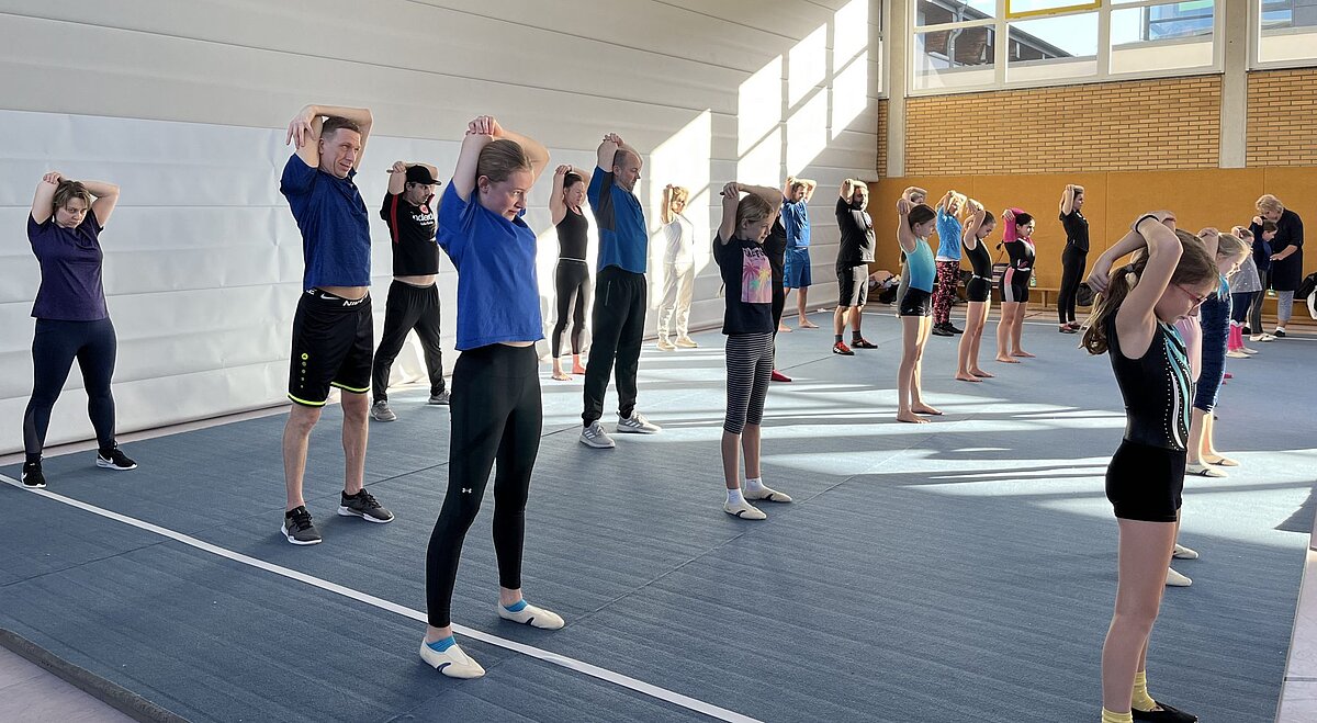Die Eltern (5 Papas, 6 Mamas und eine Oma) der Aufbau- und Leistungsgruppe durften lernen, was ihre Kinder jede Woche aufs Neue in der Halle leisten. Zusammen mit den Trainerinnen der Gruppen, konnten die Eltern mit ihren Kindern sich in einem Sondertraining an allen Geräten ausprobieren.