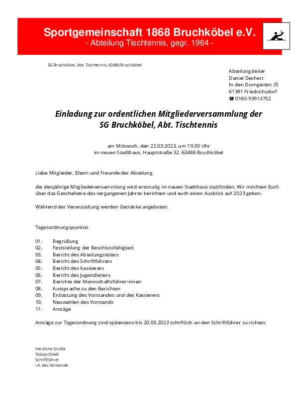 Einladung zur ordentlichen Mitgliederversammlung der SG Bruchköbel, Abt. Tischtennis