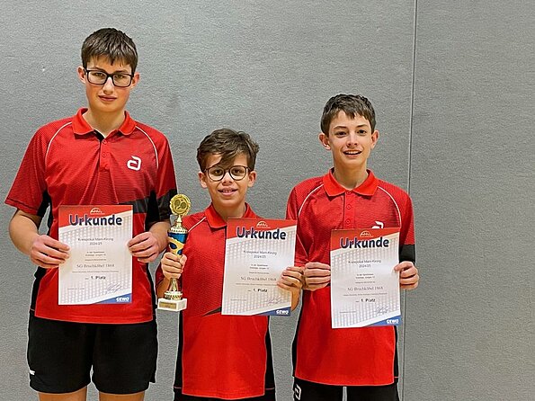 Am ersten Adventssonntag fand das Finale des Kreispokals des Tischtennisnachwuchs aus dem Main-Kinzig-Kreis statt. Zwei Bruchköbler Mannschaften konnten sich im Vorfeld für die Finals qualifizieren. Die Jungen U13 der SG Bruchköbel mit Julian, Jonas und Justin konnten ihren Titel aus dem Vorjahr mit einem 4:1 im Finale gegen den TV Meerholz verteidigen. Das Team der Jungen U 15 mit Moritz, Marten und Franziskus schaffte es nach zahlreichen spannenden Ballwechseln ebenfalls ins Finale. Dort standen sie dem TTV Gründau gegenüber. Mit einem zum Schluss deutlichen 4:0 Sieg konnten sie den Kreispokal für die SGB erringen und somit den zweiten Titel holen. Damit sind die beiden Teams für den Bezirkspokal qualifiziert.