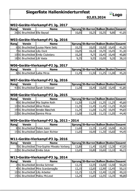 In der P3 starteten insgesamt 6 unserer Turnerinnen. Mit guten Leistungen an allen 4 Geräten erturnte sich Tina im Jahrgang 2016 trotz eines Sturzes am Schwebebalken noch den 7. Platz. Unsere 4 ältesten Turnerinnen im Jahrgang 2014 zeigten sich hoch konzentriert und bestens vorbereitet. So war es auch kein Wunder, dass sie sich alle in einem Teilnehmerfeld von 46 Mädchen bei der Siegerehrung weit vorne einreihen durften. Annika holte sich mit voller Punktzahl am Balken die Silbermedaille. Damit erhielt sie auch eine Einladung zum Kindertrainingstag der Turnerjugend, der am 20.04.24 in Offenbach stattfinden wird. Ihr folgte mit einem winzigen Abstand von 0,05 Punkten Mira auf Platz 4.
