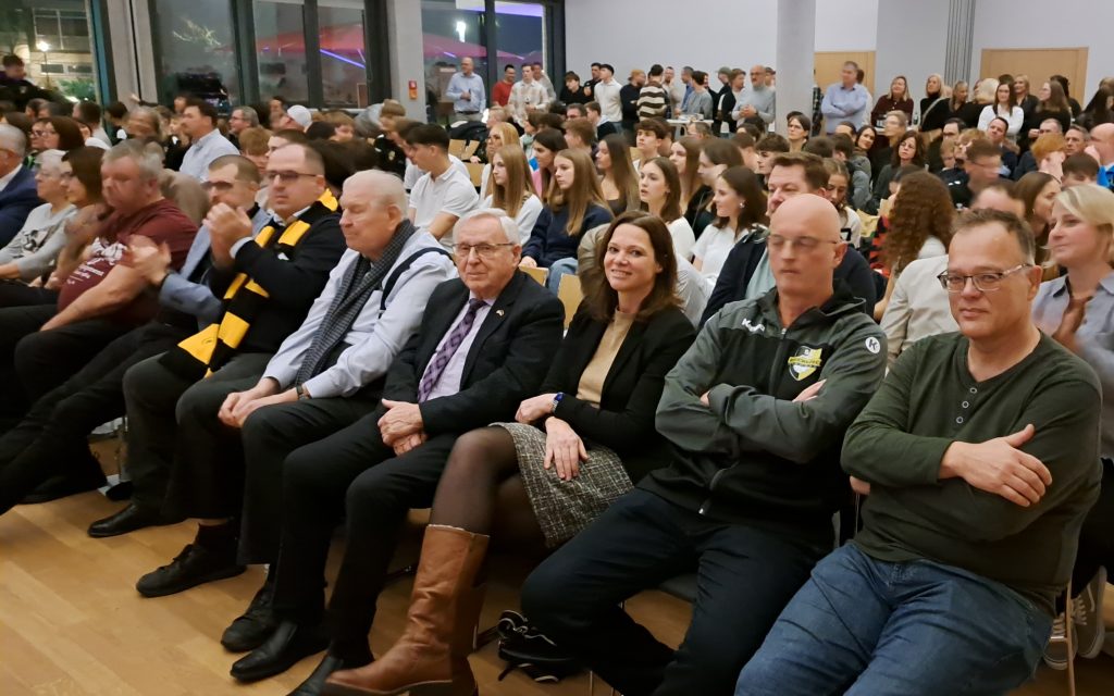 Da der große Saal des Bruchköbeler Stadthauses beim Familienabend vor einem Jahr trotz Zuschauerbegrenzung schon aus allen Nähten platzte, wurden in diesem Jahr die Tische verbannt, damit noch mehr Besucher Platz finden. Natürlich war das Haus trotzdem wieder bis zum Anschlag gefüllt. Genauso wie das Programm des Abends! Ab 19 Uhr musste das altbewährte Moderatoren-Duo Kevin Moore/Norman Demuth den gut-organisierten Ablauf der Feier so begleiten, dass am Ende alle 23(!) Programmpunkte durchgezogen werden, ohne dass man die Veranstaltung Gottschalk-mäßig überzieht! Auch die Grußworte von Abteilungsleiter Erhard Berg, Bürgermeisterin Sylvia Braun und SGB-Präsident Martin Wilhelmi (mit gelbschwarzem Schal!) passten sich dem flotten Rhythmus des Abends an.