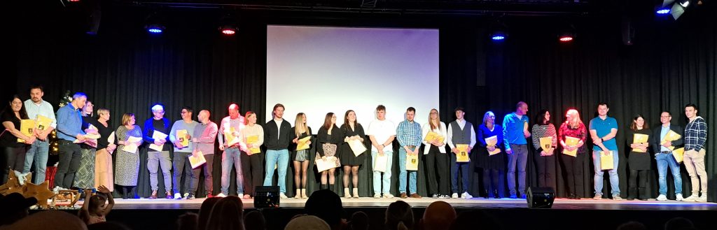 Zwischendurch bedankte sich Jugendleiterin Sandra Döhring bei ihren Mitstreiterinnen im Jugendausschuss, den Moderatoren, dem Cateringteam der Waldschänke und allen Helfern des Abends genauso, wie bei den ehrenamtlichen Helfern und Eltern der gesamten Handballfamilie. Höhepunkt der Dankesrede war der Aufmarsch aller Jugendtrainer, die in ihrer Anzahl wie immer die Bühne des Stadthauses klein aussehen ließen.