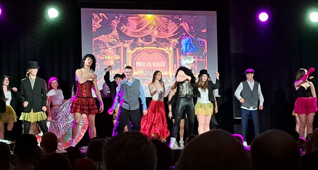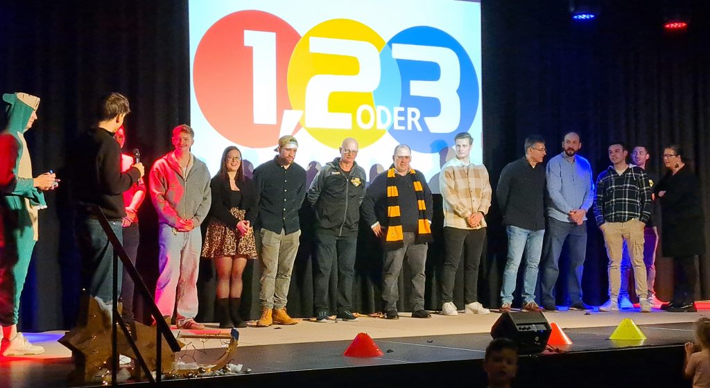 Das Programm begann mit den Jüngsten (Super-Minis), ging dann durch alle Altersklassen und endete bei den Auftritten der Aktiventeams. Am Ende standen 13 Jugend- und fünf Aktiventeams auf der Bühne und zeigten ein abwechslungsreiches Programm aus Musik, Tanz, Spiel und Spaß. Eigentlich sollte man keinen Auftritt hervorheben, denn alle Teams haben sich mächtig ins Zeug gelegt und so mussten neben den vielen Trainern der Abteilung auch die zusätzlichen Helfer, die neben dem Training die Auftritte mit den Spielern eingeübt haben, gelobt werden. Beim Tanz der männlichen B-Jugend und beim gemeinsamen Auftritt von weiblicher und männlicher A-Jugend waren neben der tänzerischen Darbietung auch die Kostüme der Tänzer sensationell. Den Abschluss des Programms bildeten wie im Vorjahr die 1. Herren, diesmal ohne Gottschalk, Hunziker und Pizza-Toni, dafür aber mit der Kinder-Kultsendung „1, 2 oder 3“, souverän moderiert von Michael „Ole“ Schanze.