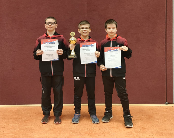 Am 04.02.24 stand für die Jungen 13 der SG Bruchköbel im Tischtennis der Kampf um den Bezirkspokal an. Nach insgesamt über einer Stunde Fahrt kam das Team um Moritz Esslinger, Julian Schusser und Justin Luca Lowag in einer prall gefüllten Halle in Herbstein an. Das Halbfinale konnte das junge Team um Mannschaftführer Moritz Esslinger in nur einer Stunde Spielzeit mit einem klaren 4:0 Sieg gegen Frischborn für sich entscheiden. Da die Mannschaft so schnell fertig war, stand nun eine längere Pause an, bis der gegnerische Finalist feststand. Im Finale traf die SGB auf die ebenfalls siegreichen Kids aus Allendorf/Lumdar. Auch hier waren die Bruchköbler Jungs nicht zu bremsen. Mit einem starken Start von Moritz Esslinger und Julian Schusser stand es nach kurzer Zeit bereits 2:0. Eine spannende Partie zeigte sich im Einzel von Justin Luca Lowag, in der er sich mit starken Angriffsschlägen den Sieg und somit den Mannschaftspunkt zum 3:0 sicherte. Jetzt fehlte der Mannschaft nur noch einen Punkt, um den Pokal nach Bruchköbel zu holen. Diesen sicherten Moritz und Julian und somit stand der Sieger der Partie fest. Mit einer guten Mannschaftsleistung konnte sich die Tischtennismannschaft der SG Bruchköbel, ohne einen Satz abzugeben, den Bezirkspokal sichern. Im nächsten Jahr werden sie dann in der Jugend 15 Altersklasse an den Start gehen.